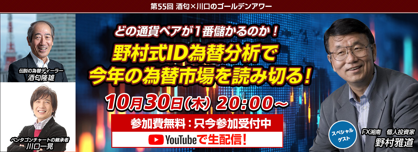 伝説の為替ディーラー「酒匂隆雄」さんと、ペンタゴンチャートの継承者「川口一晃」さんが司会を務める、YouTube番組「第55回 ゴールデンアワー」が10月30日20:00より配信されます。