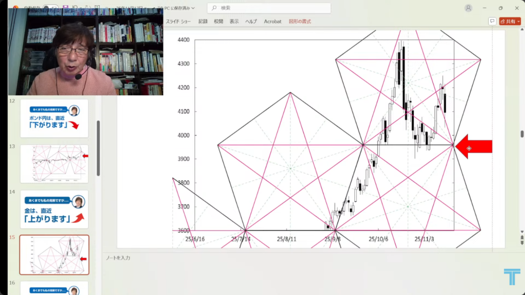 ペンタゴンチャートで150円が強い下値支線として機能しており、直近では右肩上がりのラインを下側で通過・変化日が週央(18日)に控えているため、短期の押し目を挟みつつも中期では上昇余地(156〜158円)が残っていると判断しているため。