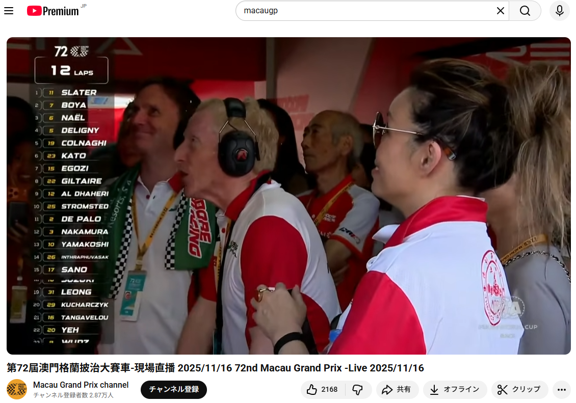 今回のマカオグランプリですが、YouTubeでもライブ配信されており、酒匂さんが真剣に観戦する様子も配信されてました!