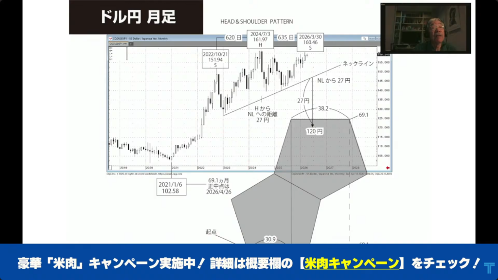 若林氏は、現在のドル円チャートに「ヘッド・アンド・ショルダー(三尊天井)」という、強力な下落反転のパターンが出現していると指摘します。