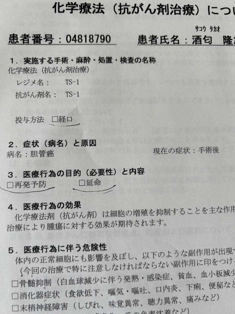 病院から貰った説明書には、抗癌剤投与の目的として、再発予防と延命とある。