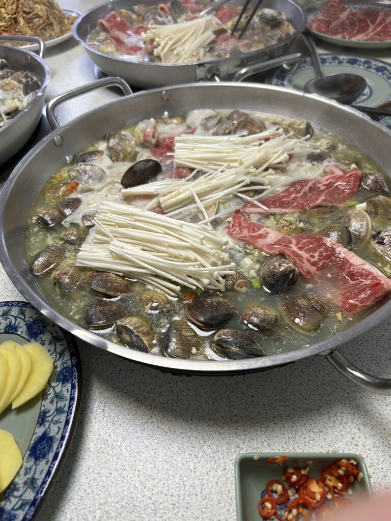 スープたっぷりの大きな鍋にアサリがドッサリ入っており、その中に牛肉,豚肉、薄切の魚、海老のすりみ、そして野菜を入れて食べるのだが、実に美味しい!