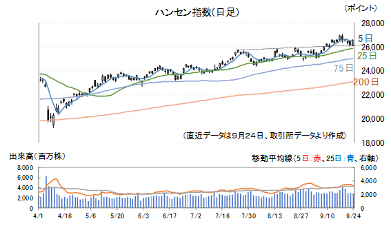 24日(水)のハンセン指数は安寄りしたものの、その後はリバウンド基調となり、終値は1.37%高の2万6518.65ポイントで引けました。