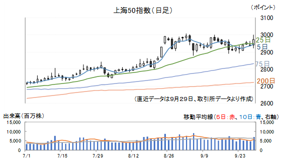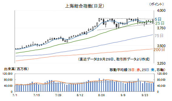 10月1日(水)から8日(水)にかけて、6営業日にもわたる国慶節、中秋節休暇が控えていることもあり、29日(月)の上海総合指数は“持ち合い上抜け”というところまでは行きませんでした。
