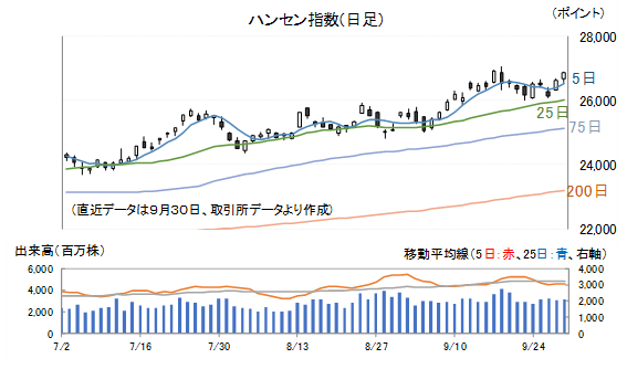 ハンセン指数は9月18日(木)、ザラ場で年初来高値を更新した後、浅い押し目を付けていましたが、今週に入り2日連騰となったことで、年初来高値圏付近まで戻しています。