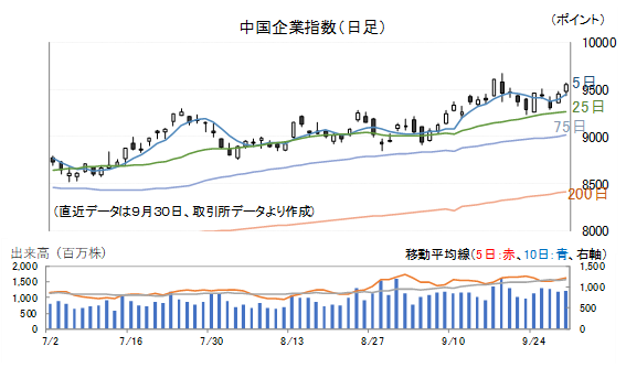 以下、9月30日までのハンセン指数、中国企業指数の日足を示しておきます。