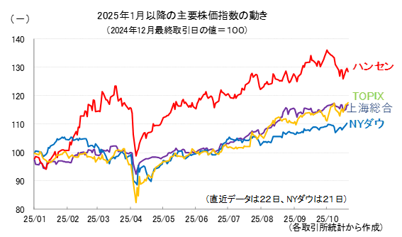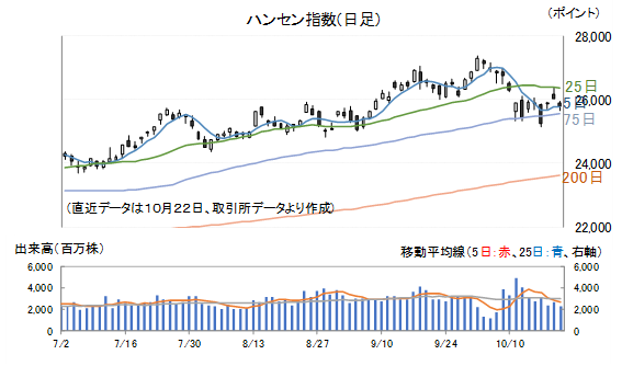 ハンセン指数は10月2日(木)、終値ベースで2021年7月23日以来の高値を付けた後、中国側によるレアアースの輸出管理強化、米国側による100%課税発言などを巡り、米中間の緊張が高まったことで一旦大きく売り込まれましたが、今回も10月末に実現しそうな米中首脳会談を通して、最終的には上手くまとまるとみる市場関係者は多く、13日(月)以降は下げ止まっています。