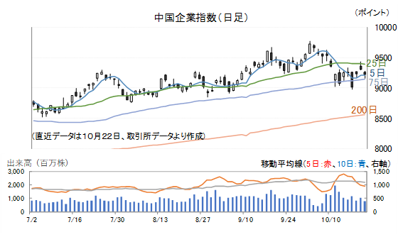 22日(水)のは中国企業指数は0.85%安で引けました。