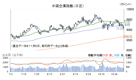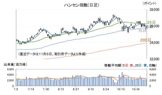 一旦緊張が高まった米中関係ですが、釜山での米中首脳会談が開かれることで緊張緩和期待が高まり、ハンセン指数は10月17日(金)を底値として戻り歩調となりました。