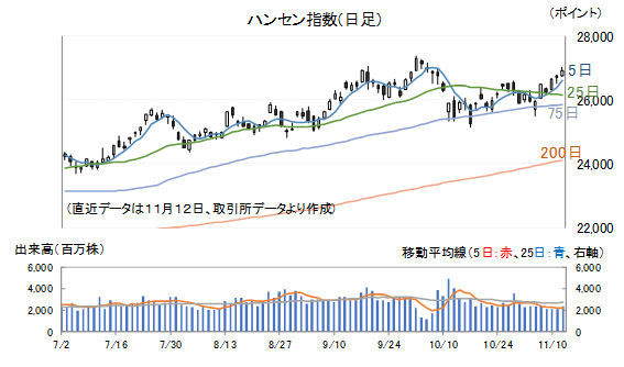 その直後となる10月2日に記録したハンセン指数の年初来高値は2万7287.12ポイントで、12日(水)の終値はその高値まで後1.4%に迫っています。