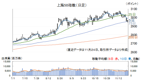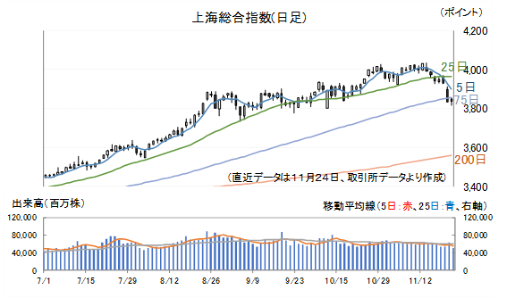 24日(月)の上海総合指数は高寄りしたものの、すぐに下落、前場は下値を探る展開となりました。