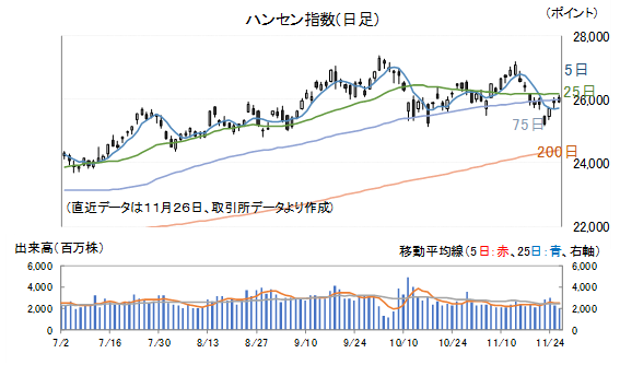 26日(水)のハンセン指数は高寄りとなったものの上値は重く、前場は戻りを試す展開となりました。