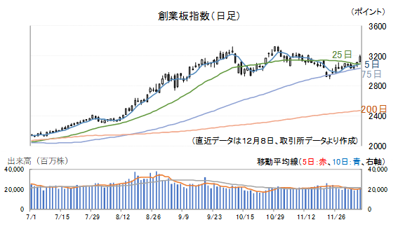 上海総合指数のチャートでは25日移動平均線が上値を抑えるような展開となっていますが、本土投資家の売買比率が高く、本土相場の先行指標ともいえる創業板指数は5日、25日、75日移動平均線が密集する中を上に抜けています。