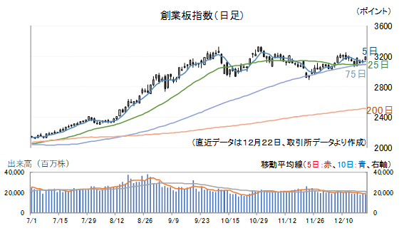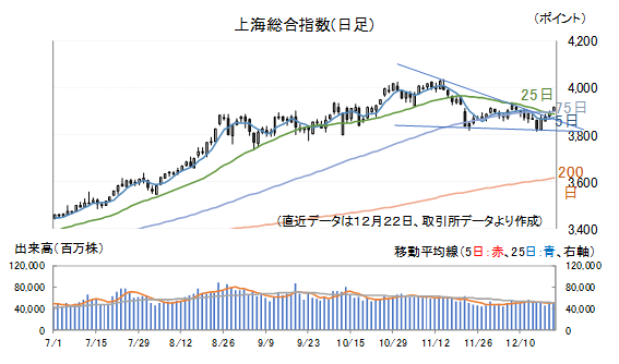 上海総合指数は11月14日に年初来高値(場中ベース)を付けた後、三角持ち合いを形成、下げトレンドとなっていましたが、持ち合いも煮詰まったところで、12月16日(火)に底打ちし、19日(金)には持ち合いを上に抜けるような形となりました。