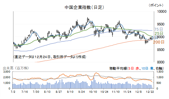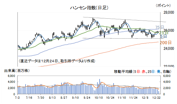 ハンセン指数は10月2日、11月13日の高値を結んだ線を上値抵抗線、10月17日、11月21日、12月16日の安値を結んだ線を下値支持線とする形で調整局面に入っています。