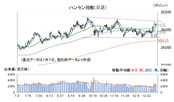ハンセン指数は依然として10月2日、11月13日の高値を結んだ線を上値抵抗線、10月17日、11月21日、12月16日の安値を結んだ線を下値支持線とする大きな持ち合いの中にあります。