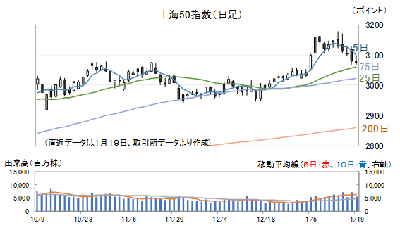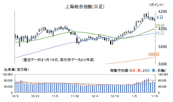 上海総合指数は終値ベースでは12月12日(月)、場中ベースでは14日(水)に高値を付けていますが、その後は調整する展開となっています。