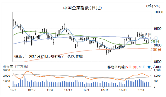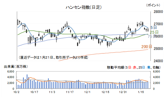 本土要因としては当局による株価安定化政策(株式市場の過熱を冷やす方向)、海外要因としてはトランプ政権のグリーンランド買収を巡るEU主要国への懲罰関税問題などから、投資家がリスク回避行動を取っていましたが、それらの影響を受けてハンセン指数も同じような値動きとなっています。