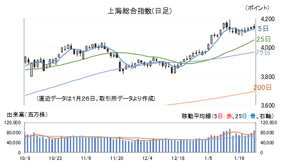 上海総合指数は終値ベースでは1月12日(月)、場中ベースでは14日(水)に高値を付けた後、調整する展開となりましたが、20日(火)に一旦底を打っており、その後は緩やかな回復基調となっています。