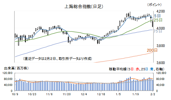 上海総合指数は終値ベースでは1月12日(月)、場中ベースでは14日(水)に高値を付けた後、調整する展開となりましたが、20日(火)に底を打っており、その後は緩やかな回復基調を辿っていました。