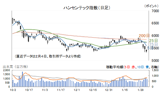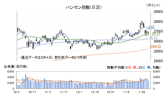 ハンセン指数は1月29日(木)、2021年7月以来の高値を2日続けて更新しましたが、その後は一旦押し目形成となりました。