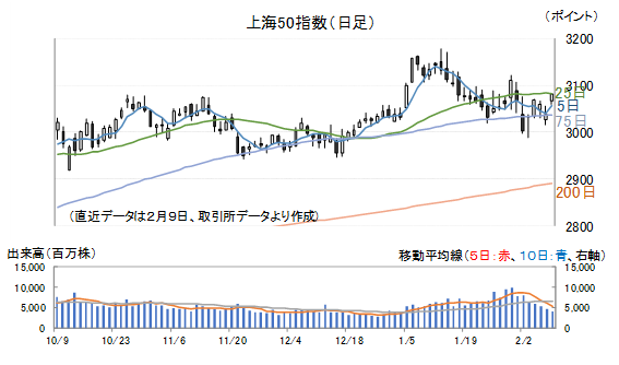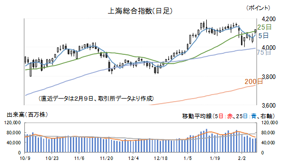 上海総合指数は1月30日以降、25日移動平均線を下回って推移していましたが、9日(月)は再び上回って引けています。