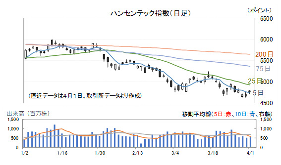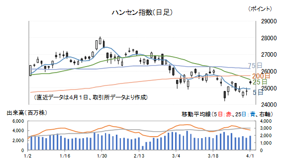 1日(水)のハンセン指数は高寄り後、終日売り買いが交錯する展開となりました。