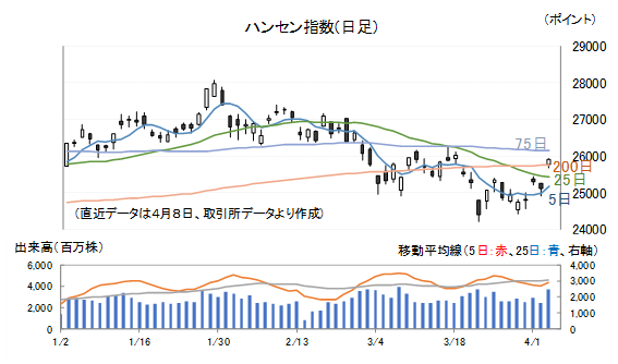 8日(水)のハンセン指数は高寄り後、上昇、終値は3.09%高の2万5893.02ポイントで引けています。