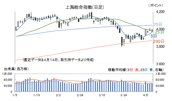 上海総合指数は、3月23日を底値として反転していましたが、4月8日(水)に米国とイランによる停戦協議が行われる見通しとなったことで戻りがやや加速しています。