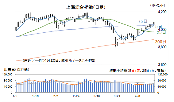 20日(月)の上海総合指数は高寄り後も上昇、後場に入り上値は重くなったものの、終値は0.76%高の3988.56ポイントで引けました。