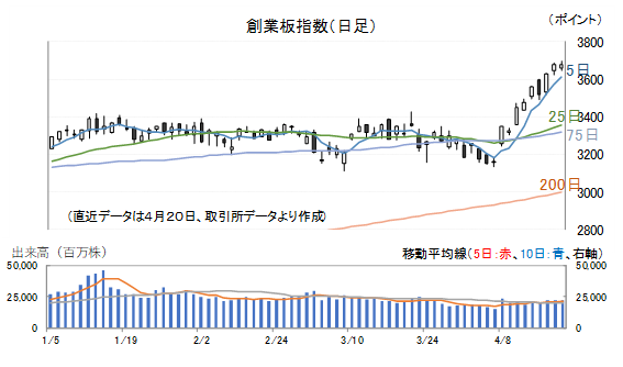 4月8日(水)以降では、前営業日終値比マイナスで引けたのは、9日(木)、17日(金)の2日だけで、20日(月)の日足は上下にごく短いヒゲを付けたやや大きめの陽線を付けています。