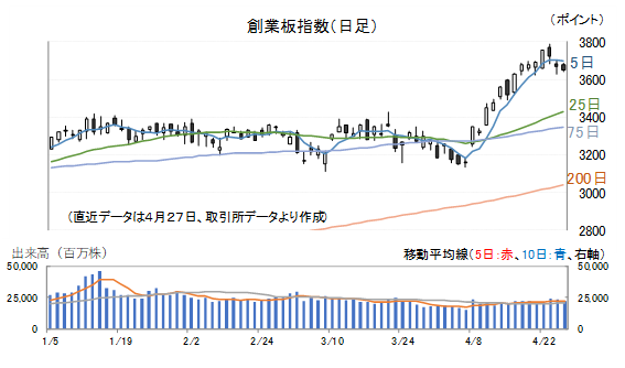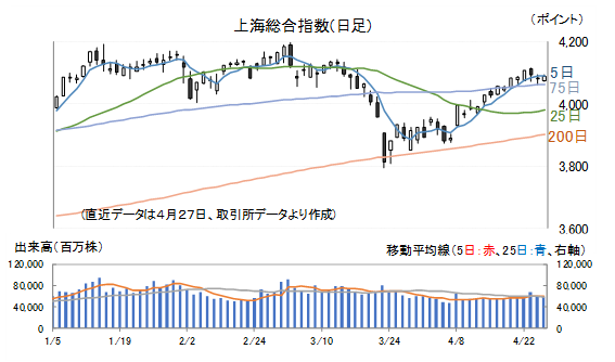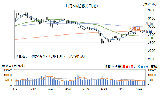 上海総合指数は、3月23日を底値として反転、4月8日に停戦協議が行われる見通しとなったことで戻りは加速しましたが、先週後半は2日続落、27日(月)は一旦下げ止まるといった展開となっています。