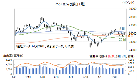 29日(水)のハンセン指数は高寄り後、好決算銘柄などを中心に買いが入り上昇、終値は1.66%高の2万6111.84ポイントで引けています。