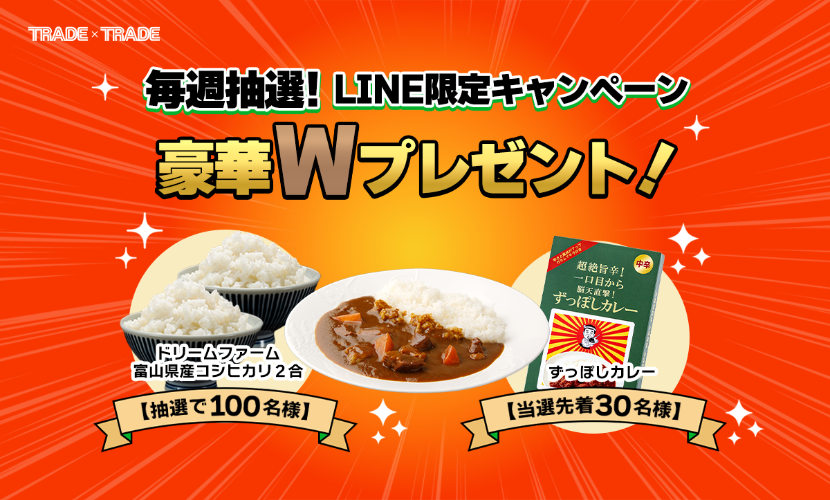 抽選で100名様に届く「富山のお米」に加え、先着30名様限定で「絶品カレー」もセットでお届けします。毎週1回、当たるまで挑戦できるチャンス。