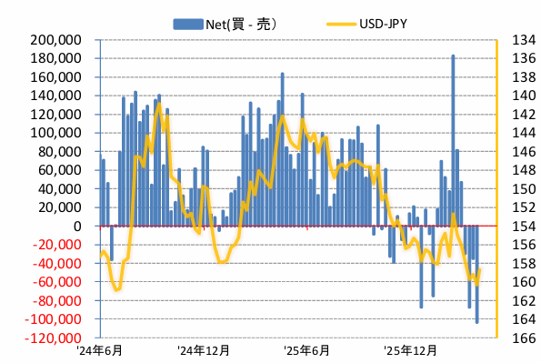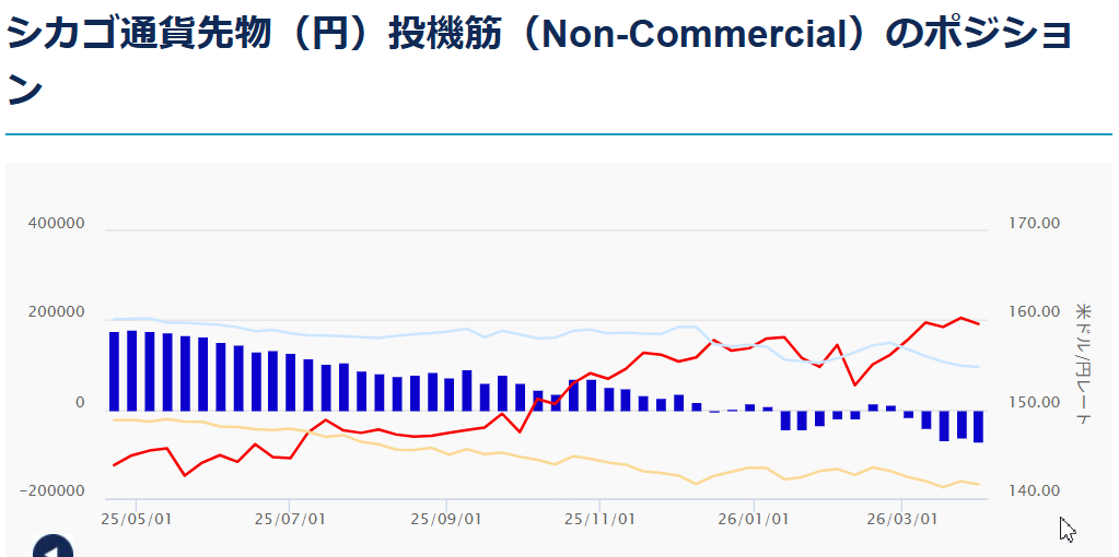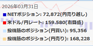 この状況下で我が国投資家は相変わらず介入期待でドルの売り持ちを増やして、3月30日付けで前週から6億ドル売り増して10億ドルのショート、逆にシカゴ・IMM.はドルの買い持ちを7億ドル増やして57億ドルのロングとなっている。