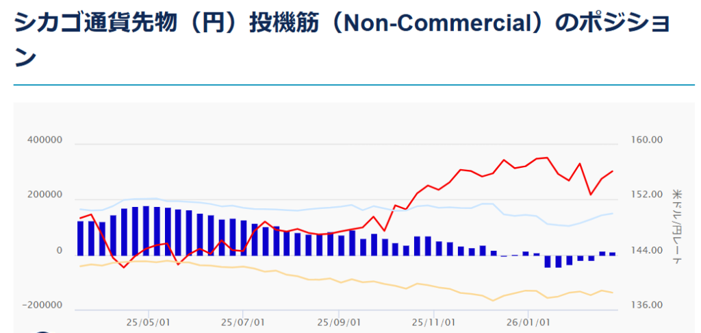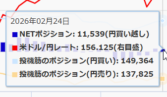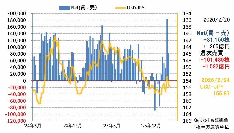 シカゴ・IMM.は前週の約11億ドルの売り持ちから2億ドル買い戻して約9億ドルの売り持ちを保持し、我が国個人投資家は前週の約19億ドルの買い持ちから11億ドルを売り戻して約8億ドルの買い持ちに留めている。