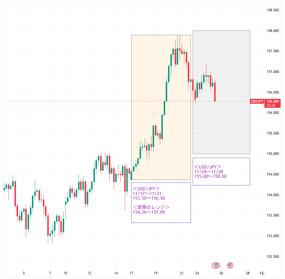先週のドル円相場は、20日に発表された10月FOMC.の議事要旨に於いて“多くの参加者は自身の経済見通しに基づけば、年内は政策金利を据え置くことが適切になる公算が大きいとの立場を示唆、12月の利下げ観測が後退してドル買いが進み、一時157.89も高値を示現した。