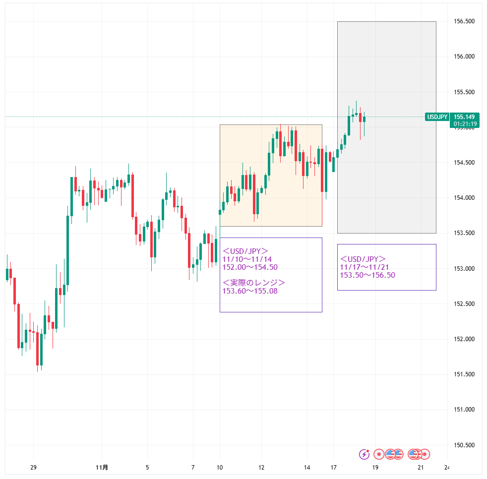 先週は目立ったイベントや指標の発表が無かった中、ドル円相場はFRB.による年内利下げ確率の後退予想と、日銀による年内利上げ確率の後退予想によりじりじりと値を上げ、週明けのニューヨーク市場では目先の節目である155円を上抜けて高値155.30を示現した。