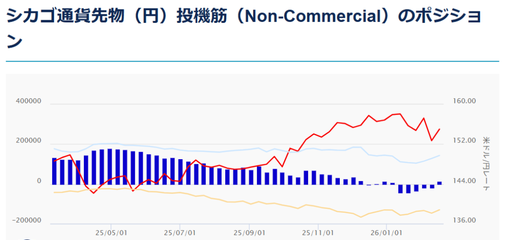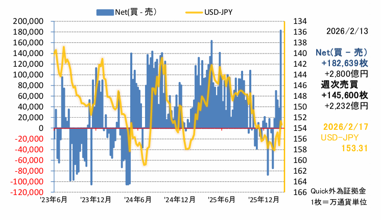 シカゴ・IMM.は先週17日(ドル円相場の終値は153.52)の時点で前週10日(ドル円相場の終値は155.88)から実に26億ドル相当(円・ロング32,061枚)の円買い&ドル売りを行い、ポジションが15億ドルの買い持ち(円・ショート19,106枚)から一気に11億ドルの売り持ち(円・ロング12,955枚)に転じた。
