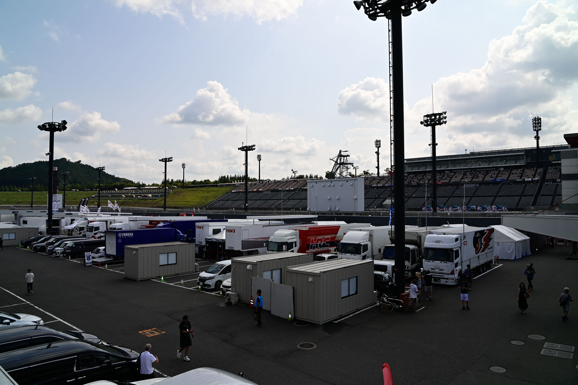 8月24日(土)、10時過ぎにサーキット場へ到着。パドックエリアはサーキット場中央部にあるため、バスでそのまま向かいました。この日は4つの大会が開催されていたため、8時過ぎからレースがスタート。パドックエリアも各大会に出場する選手やエンジニア、多くの観客で賑わっていました。