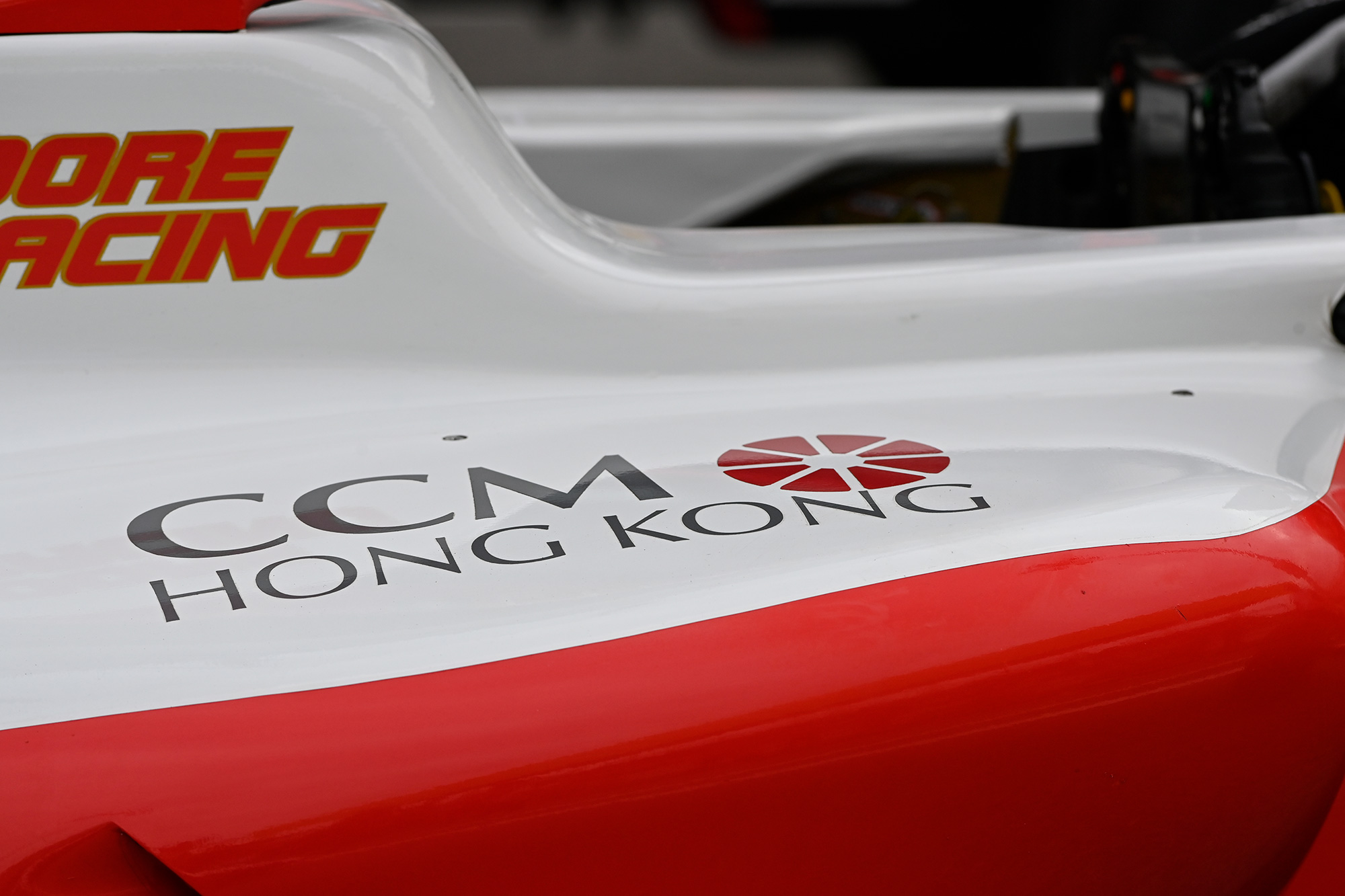 出走前のピットの様子です。今回表彰台を獲得した3名の選手が乗る「SJMセオドールプレマレーシング」のレーシングカーが並んでいます。よく見ると、機体の横には選手の名前、チーム名、そしてCCM香港社のロゴが入っています。